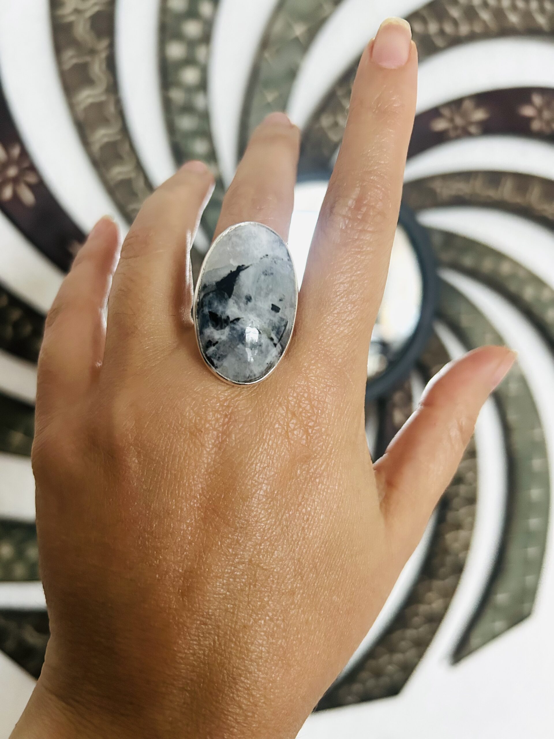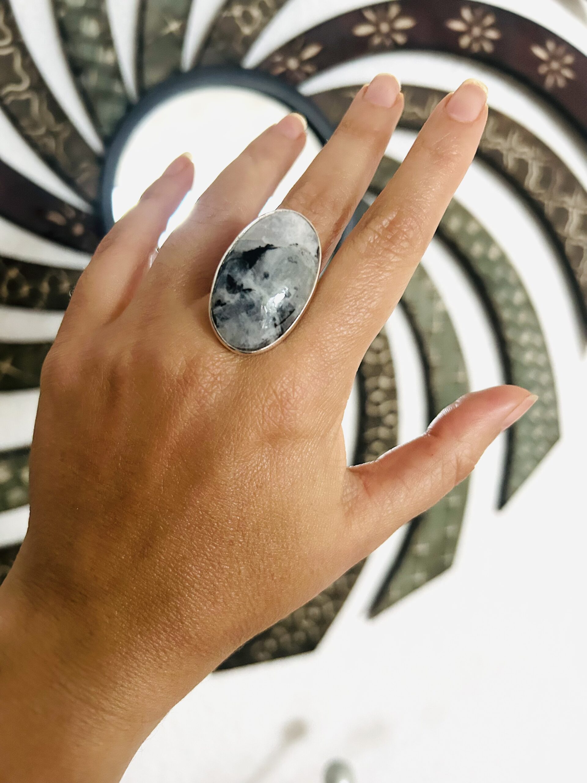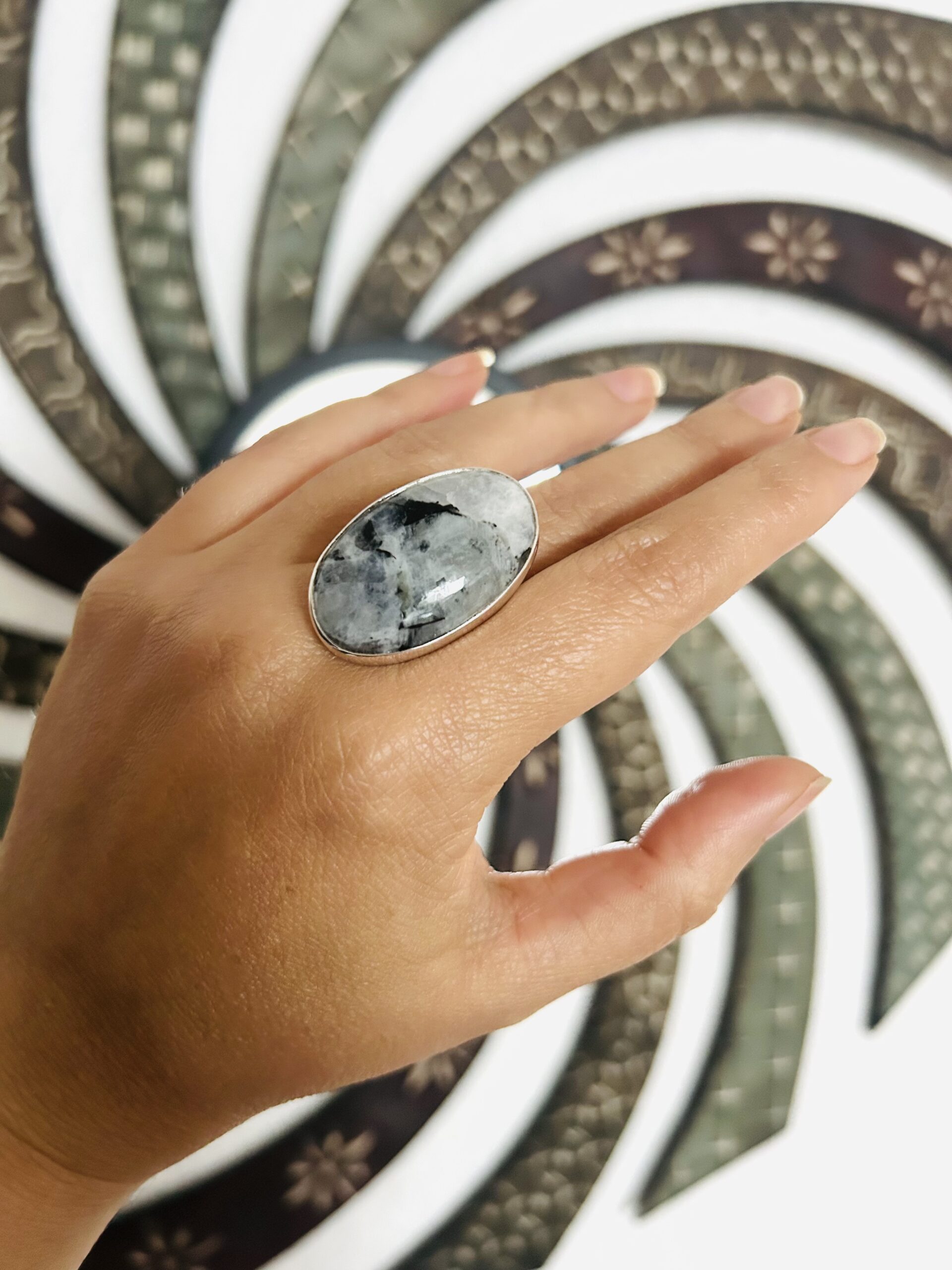 Anillo con Piedra Luna y Turmalina (aro ancho), de Plata925, ajustable en medida