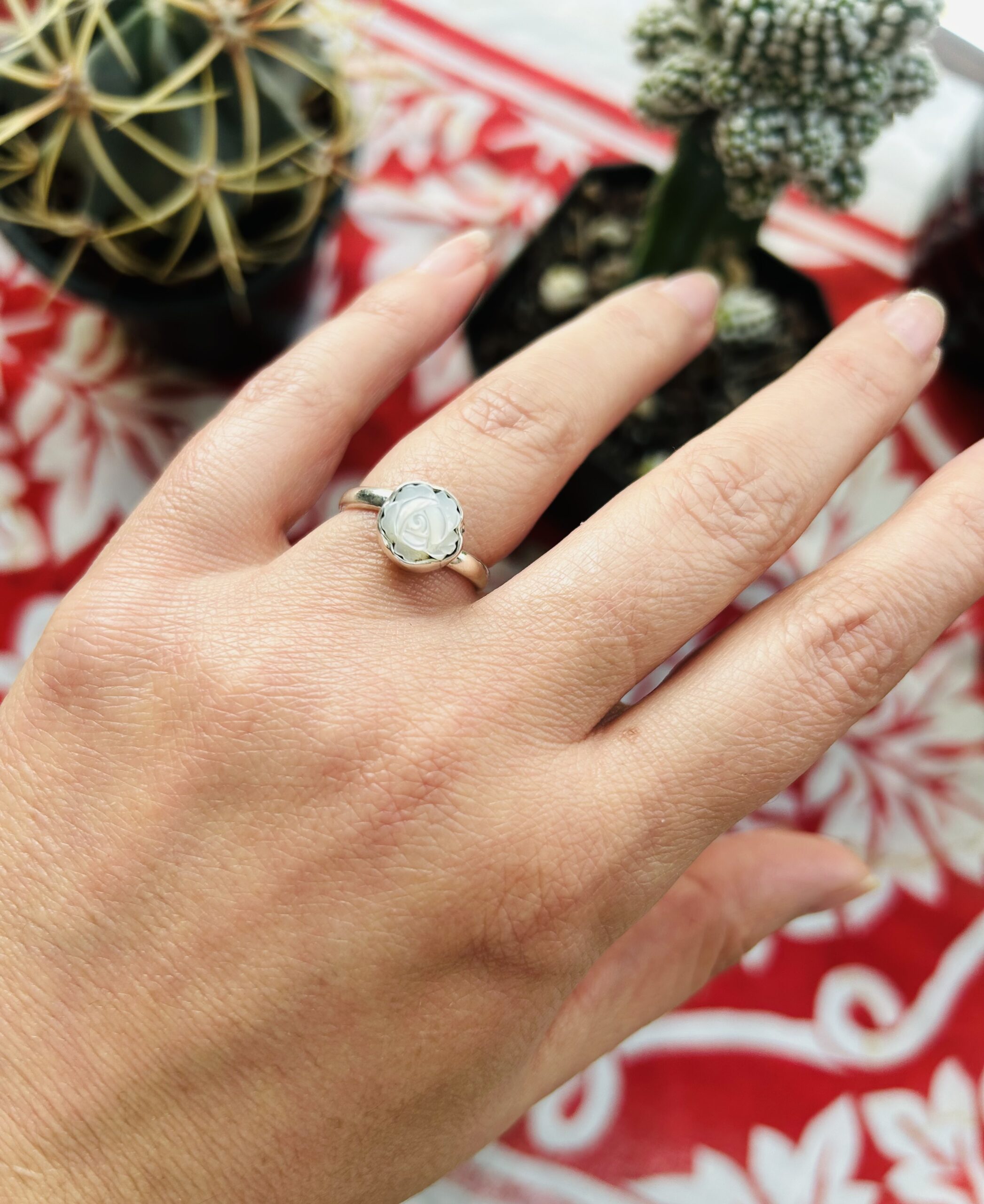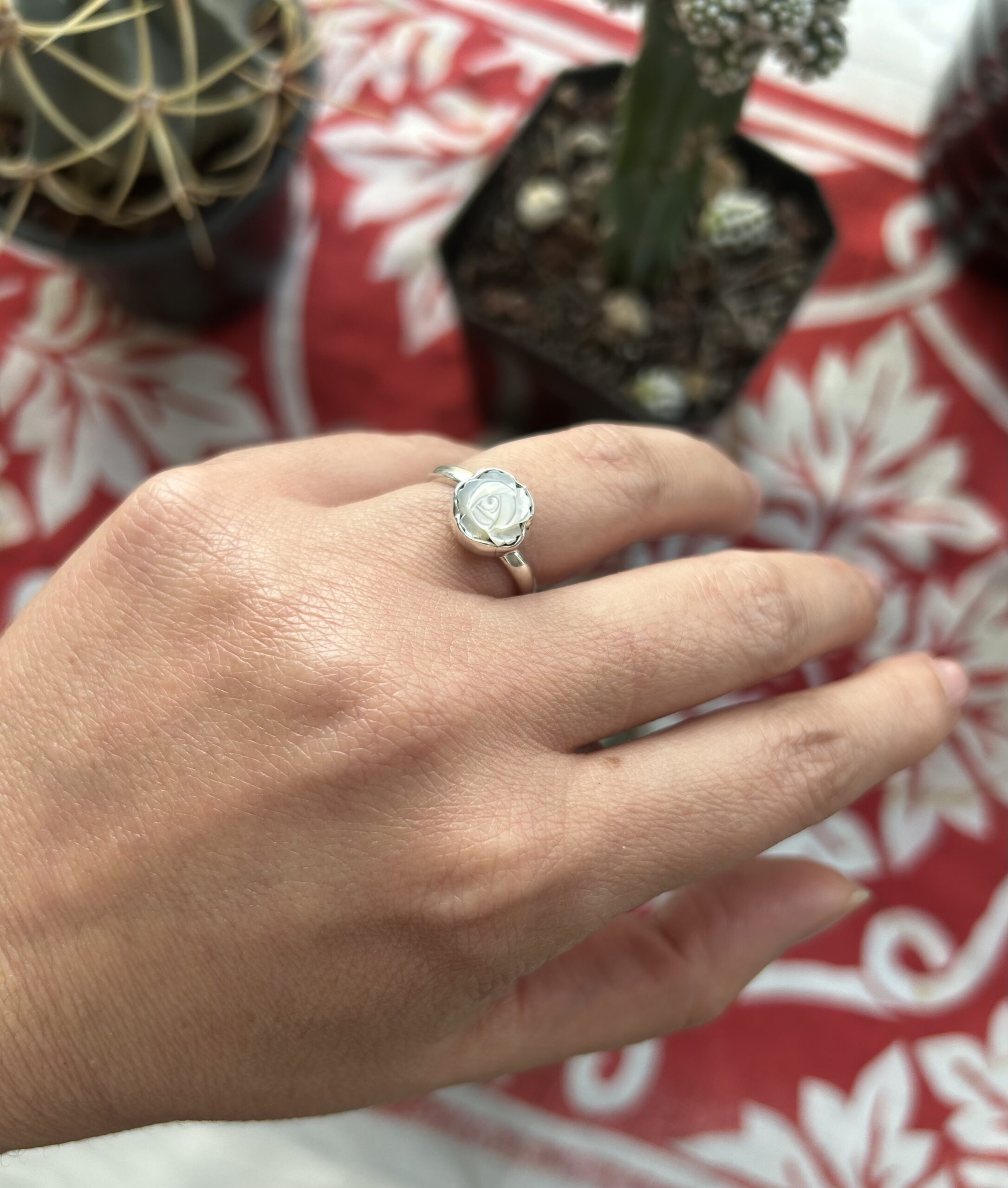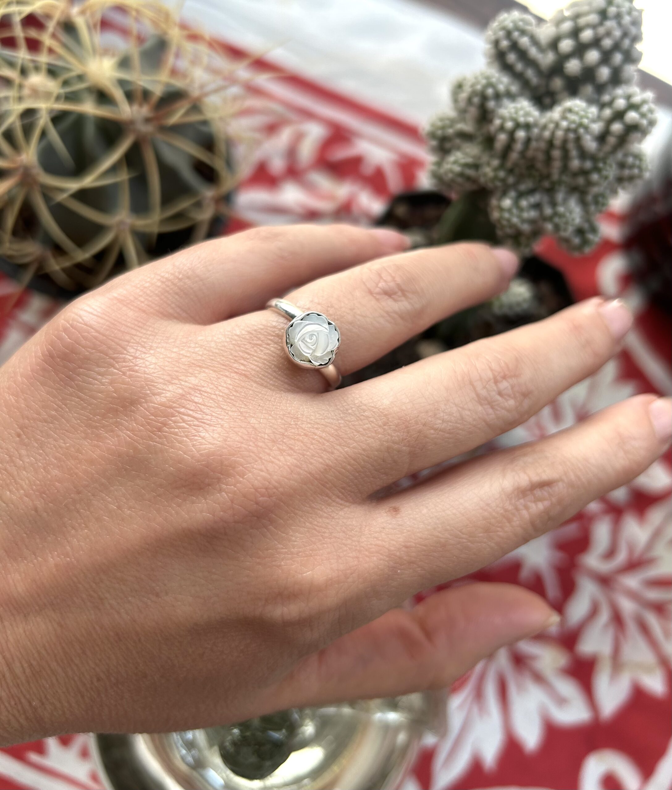 Anillo con Rosa tallada en Madre Perla