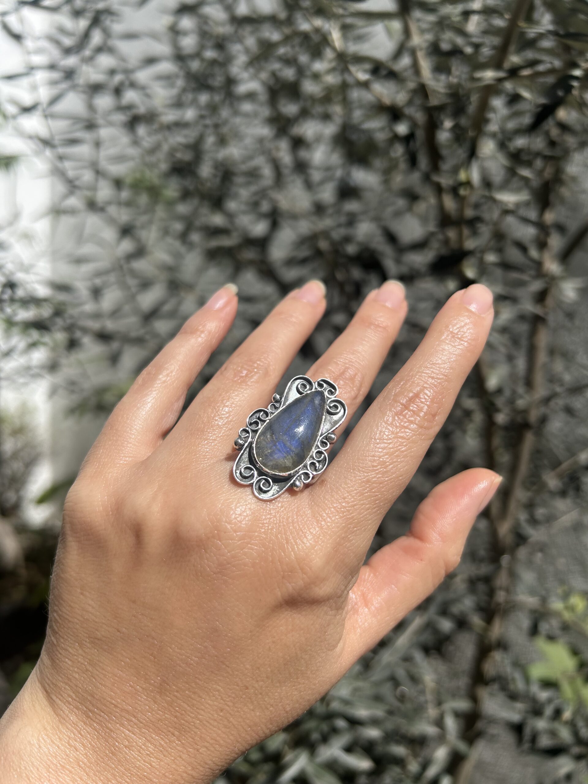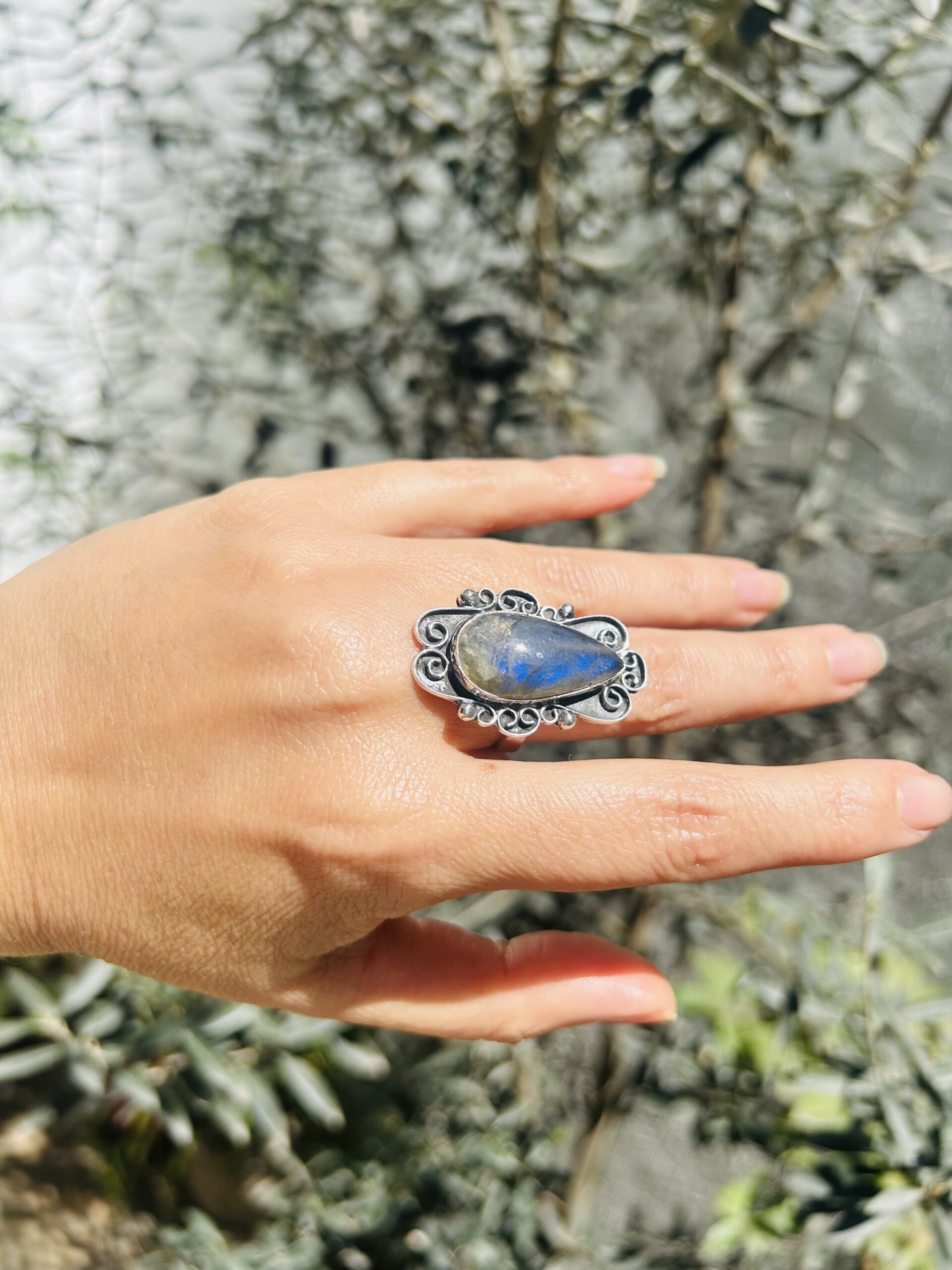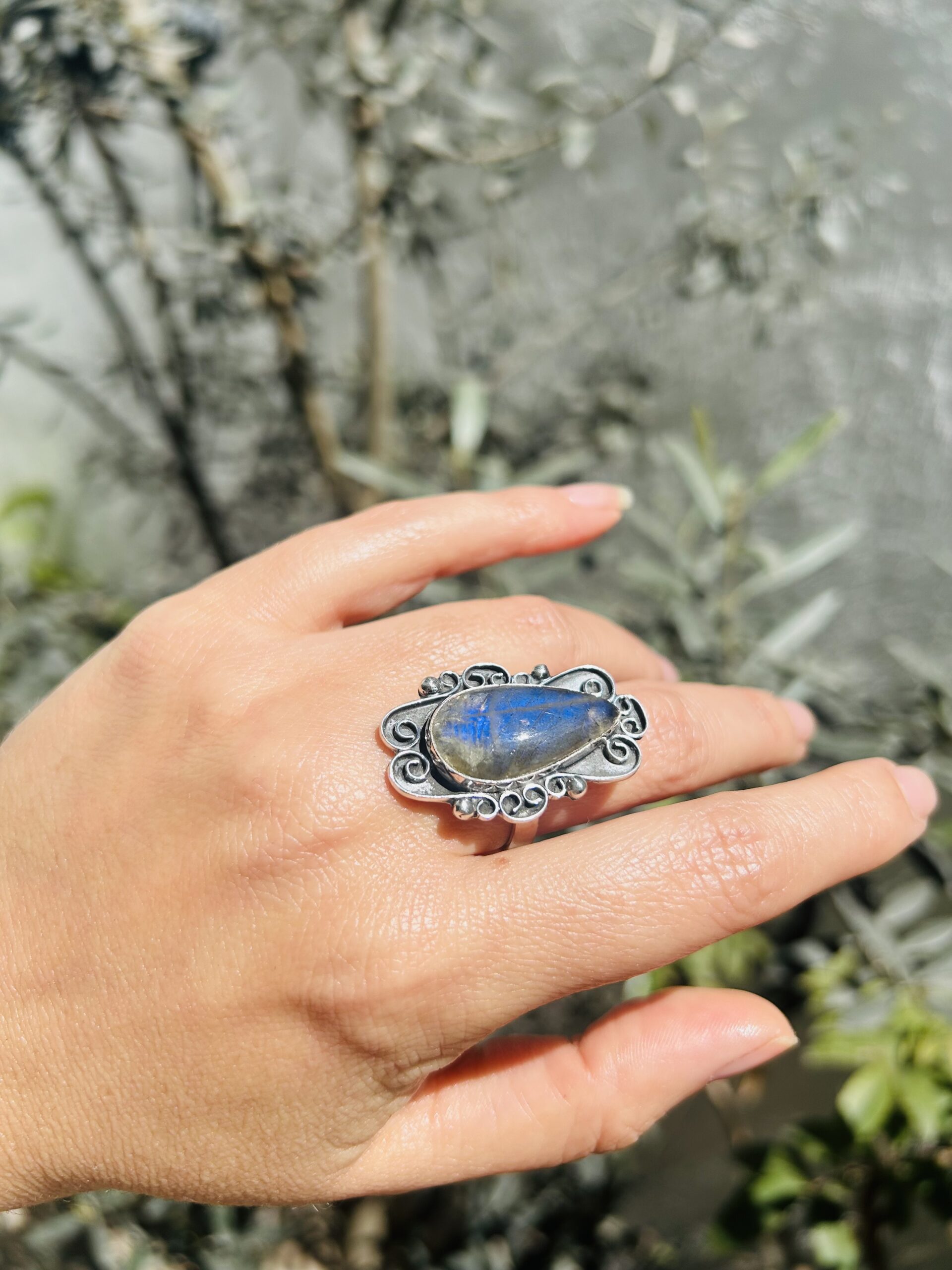 Anillo de Labradorita con Diseño, de Plata925, ajustable en medida