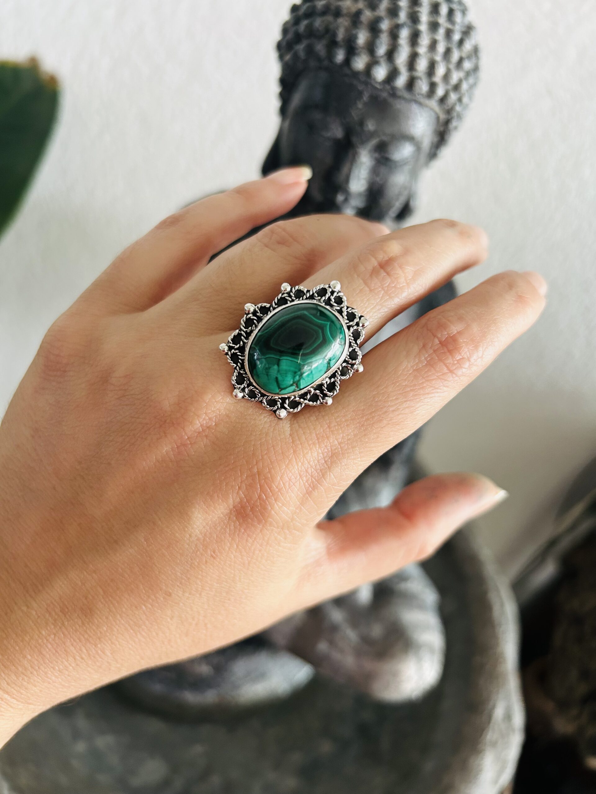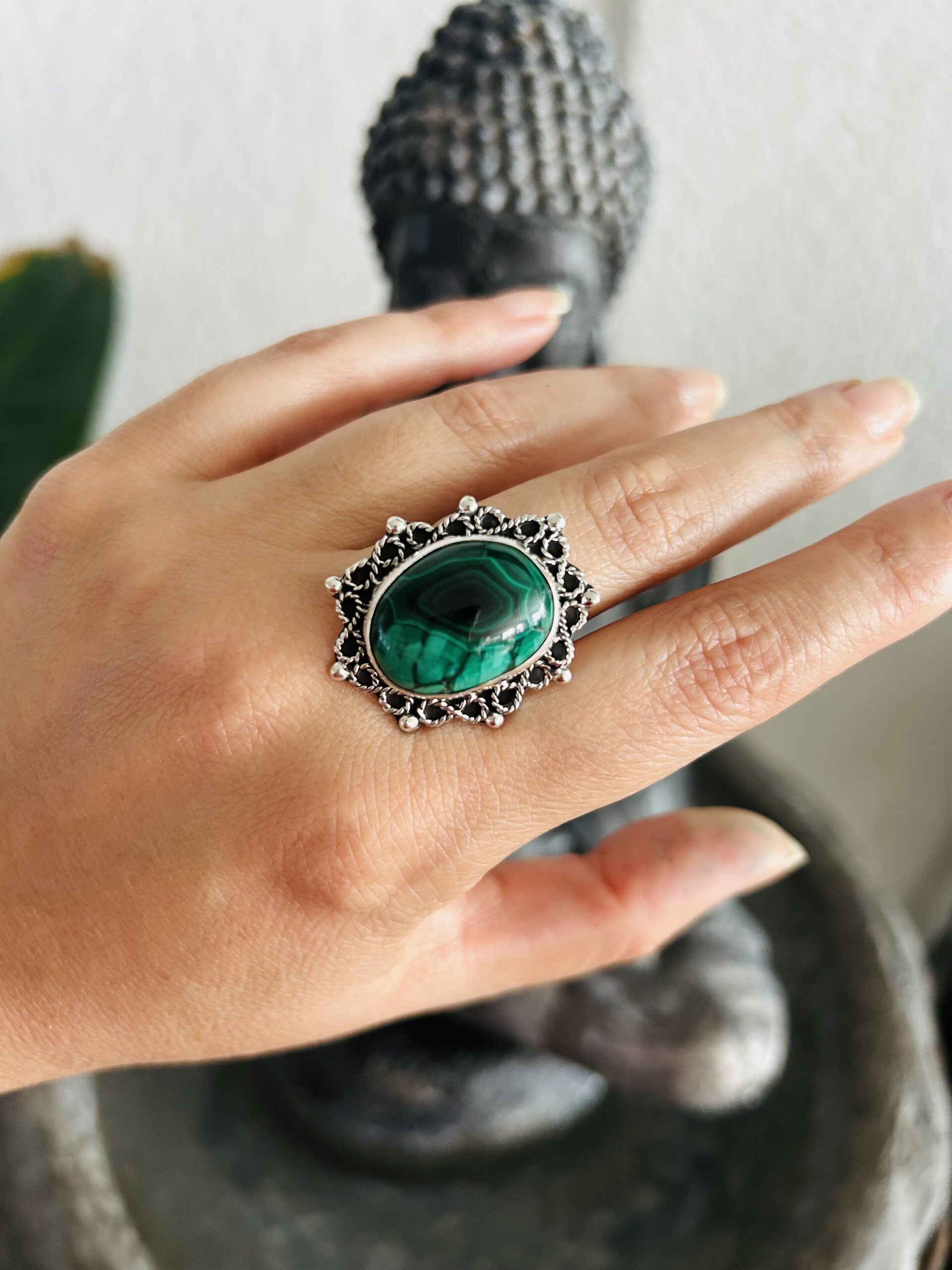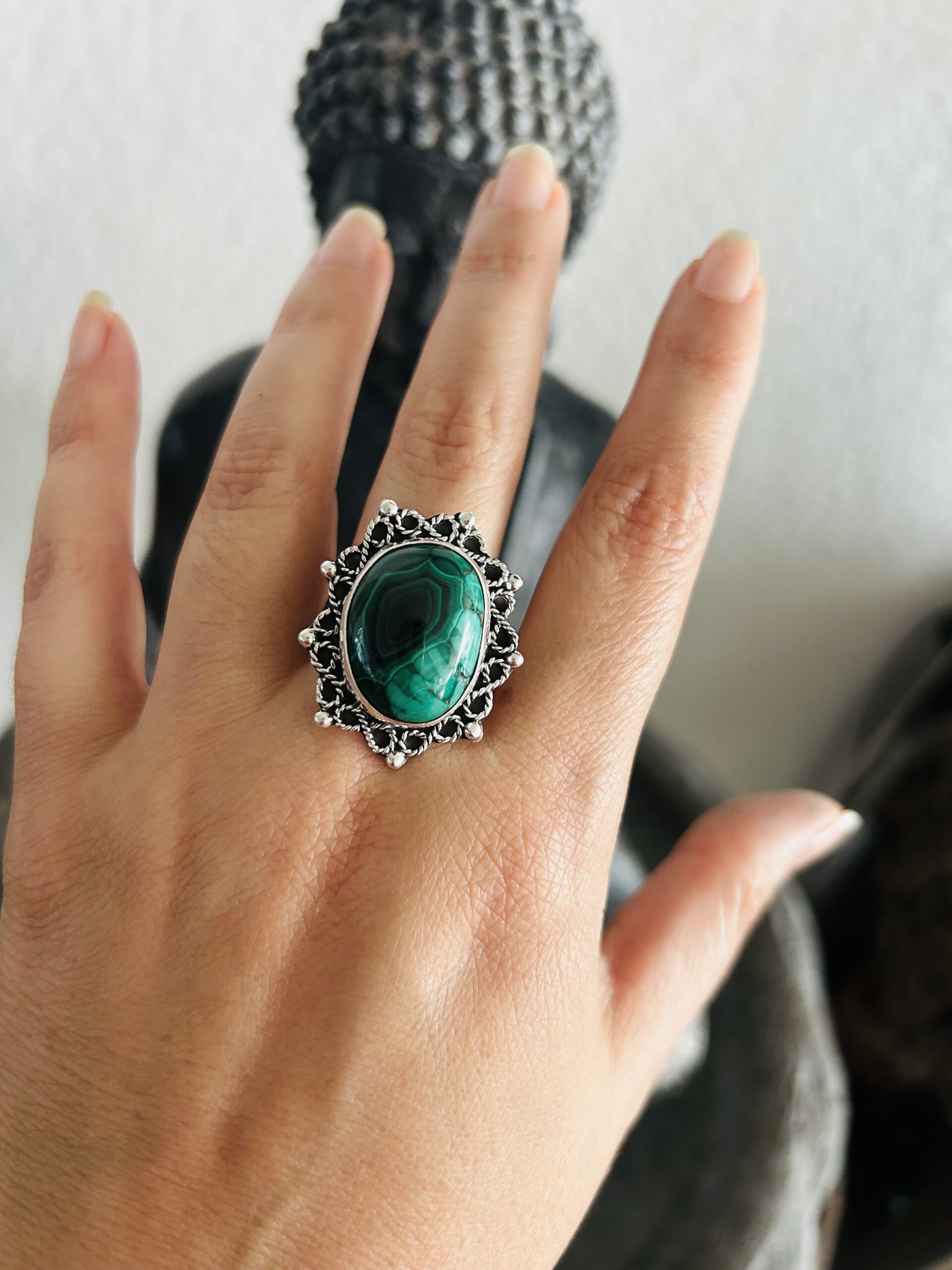 Anillo de Malaquita con diseño, de plata925, ajustable en medida