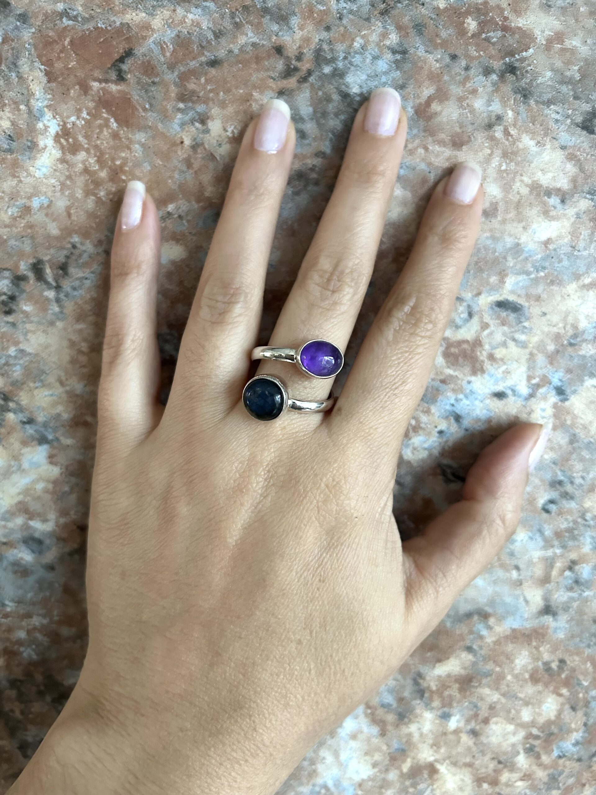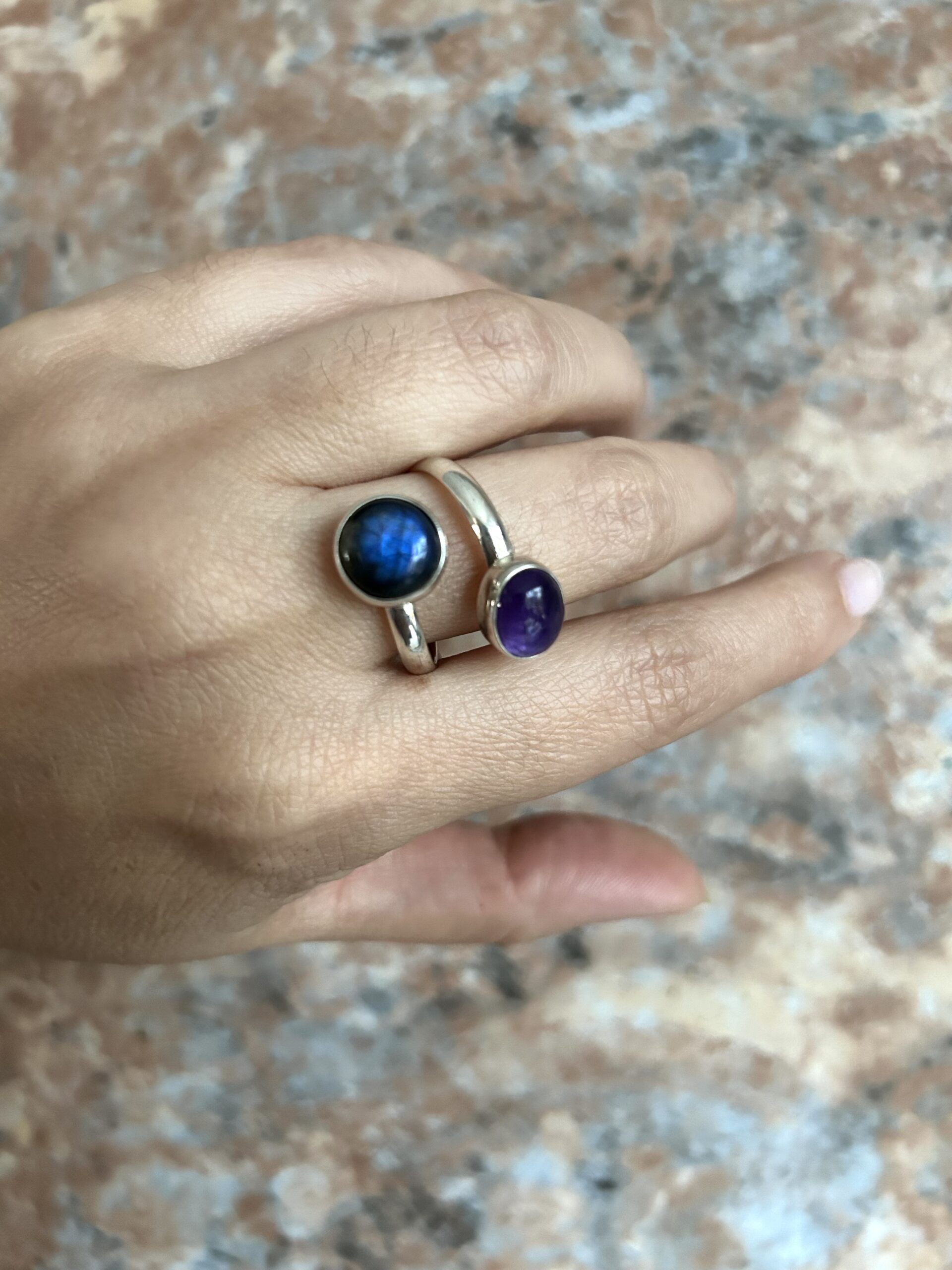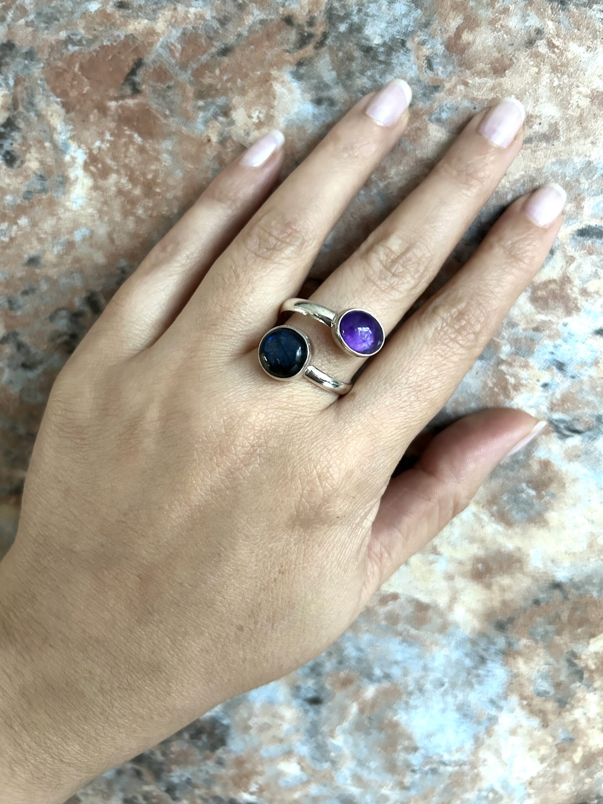 Anillo doble Labradorita y Amatista, de plata925, ajustable en medida