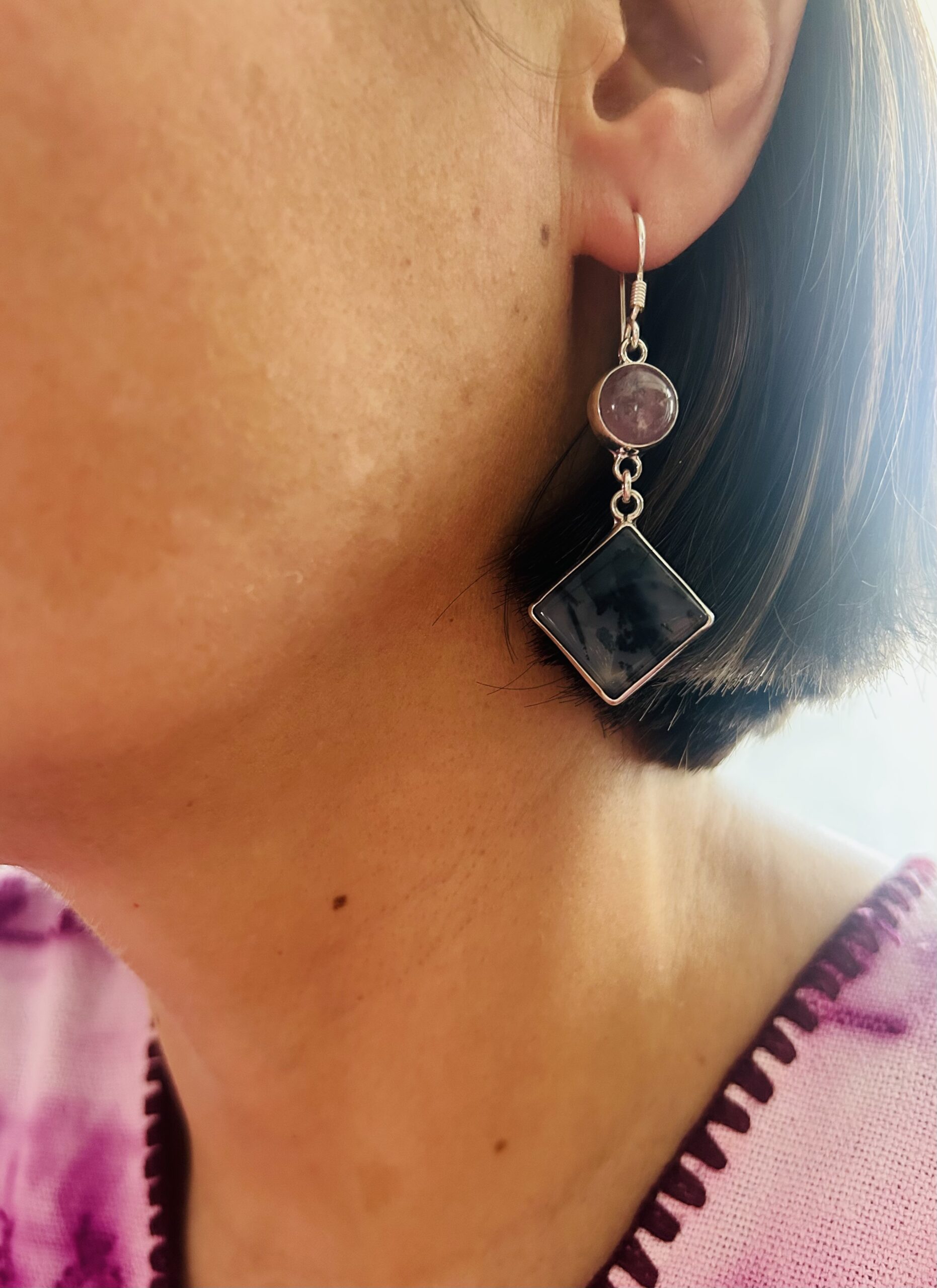 Aretes dobles colgantes con Cuarzo Rosa y Agata Dendrita