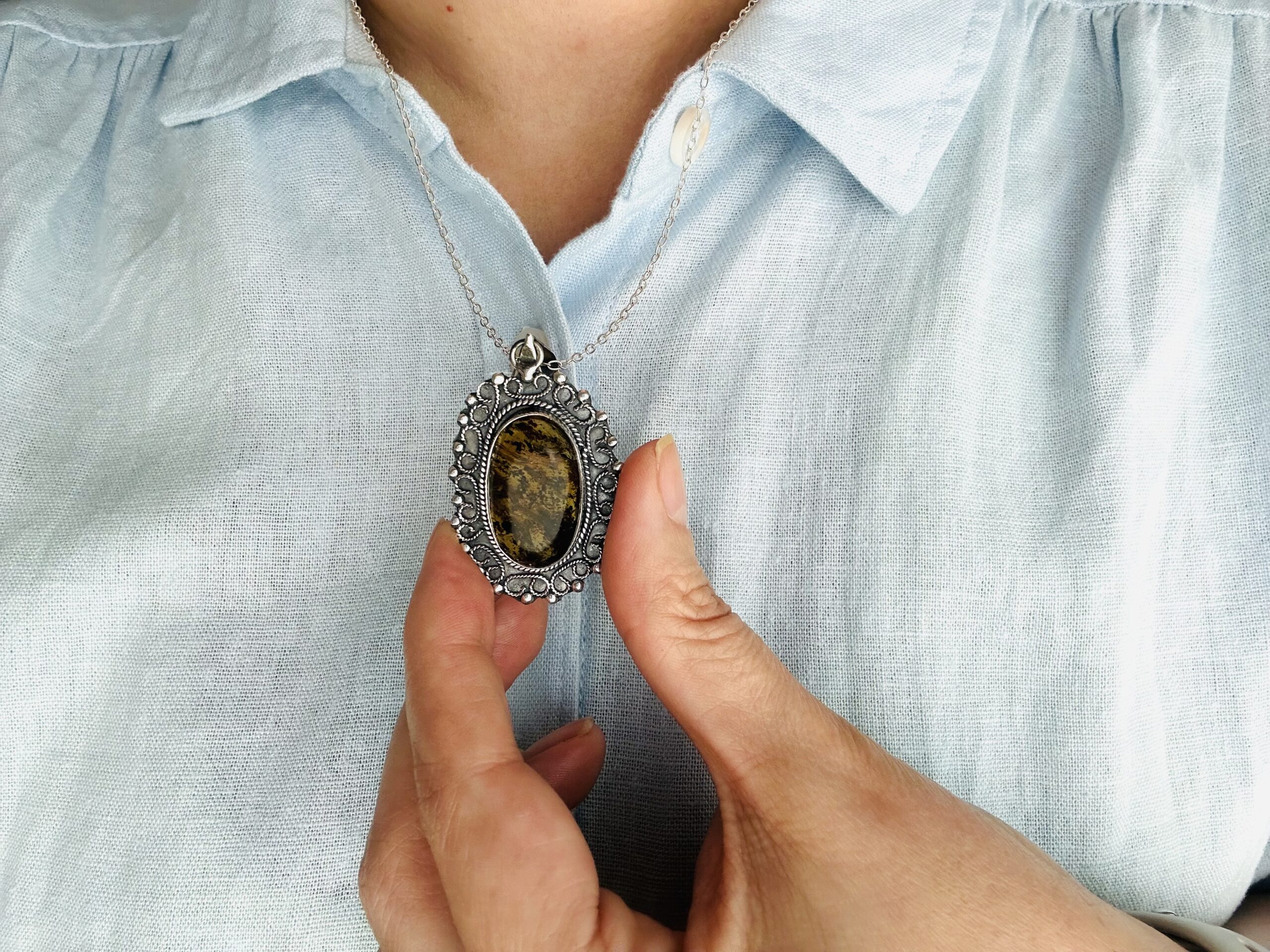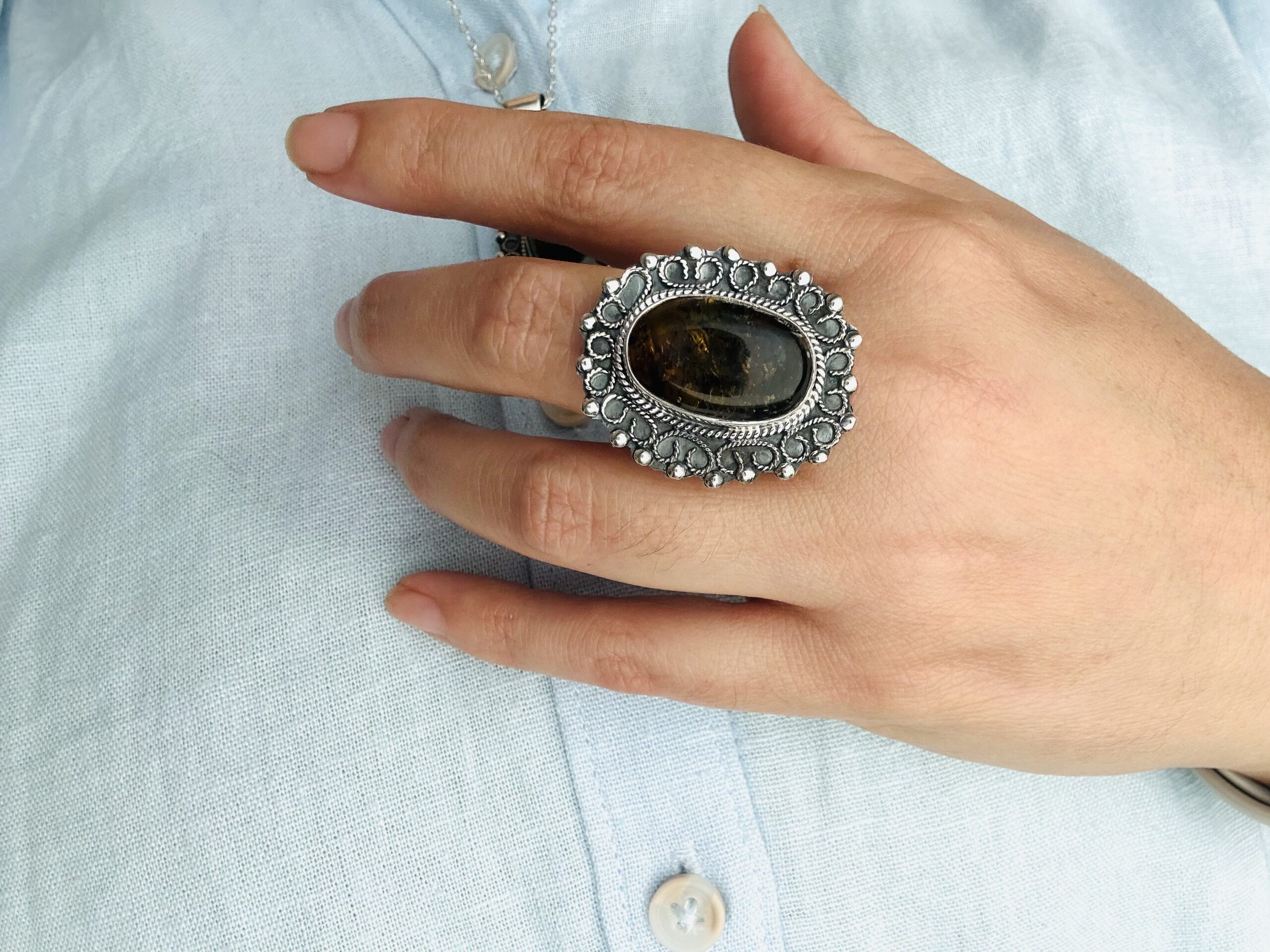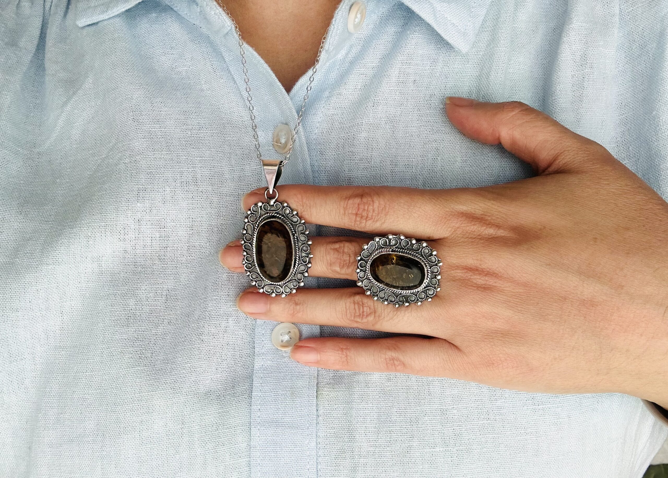 Coordinado de Ambar estilo con diseño Barroco, incluye cadena de 50 cm, dije y anillo ajustable, piezas detalladas artesanalmente, todo de plata925
