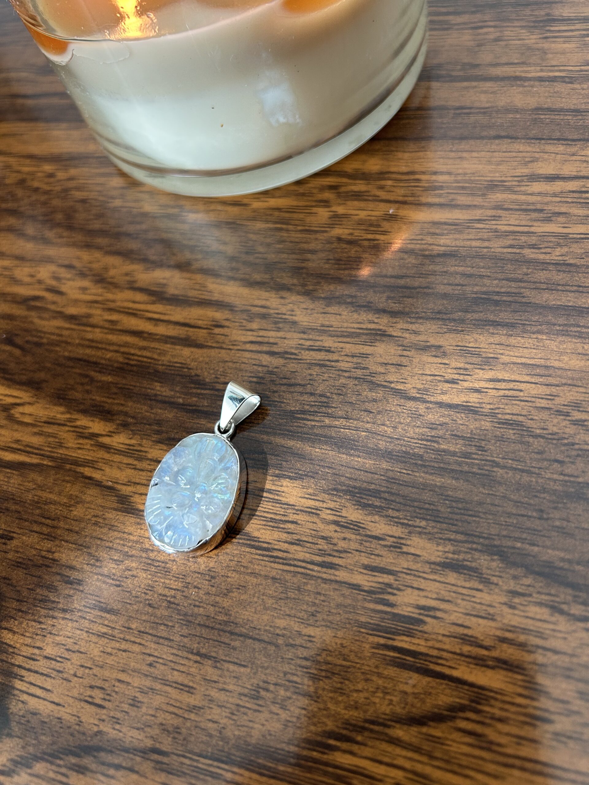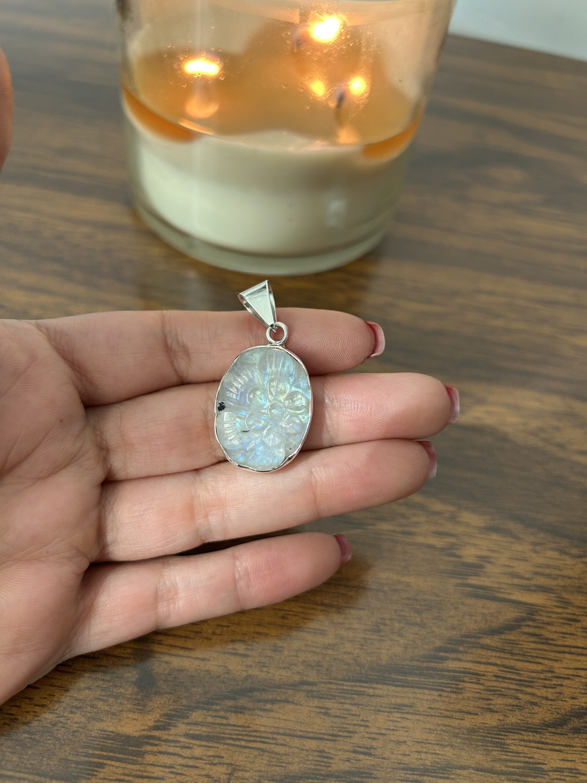 Dije de Flor tallada en Piedra Luna, de plata 925